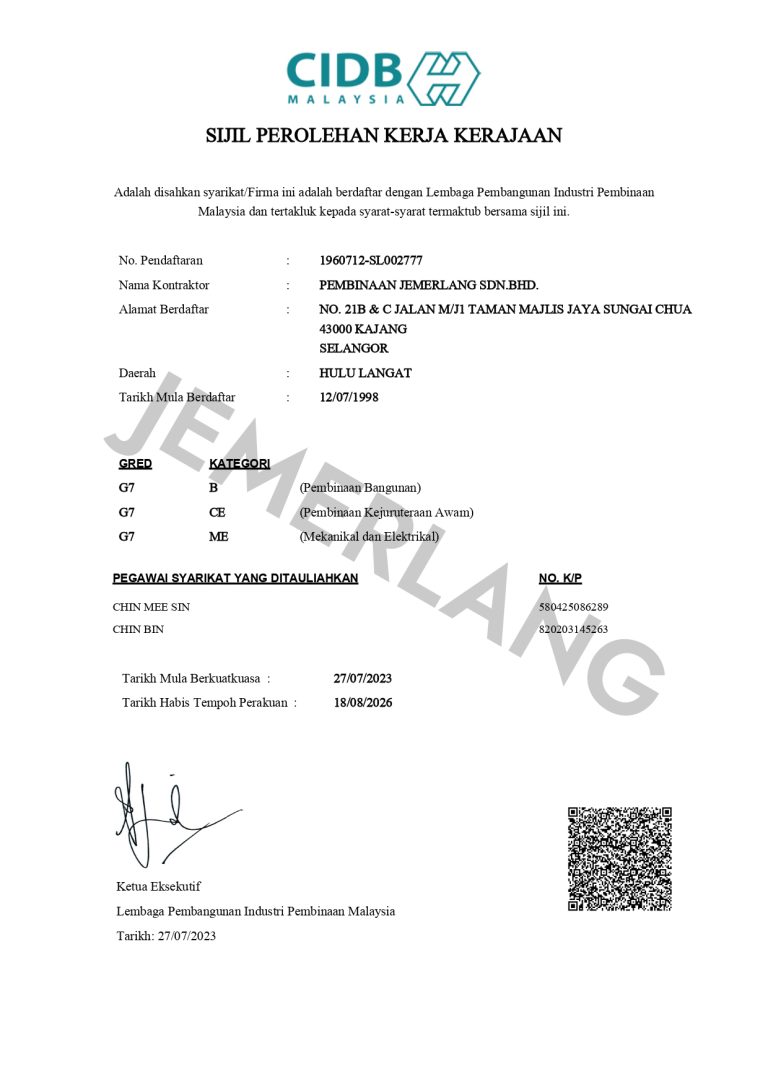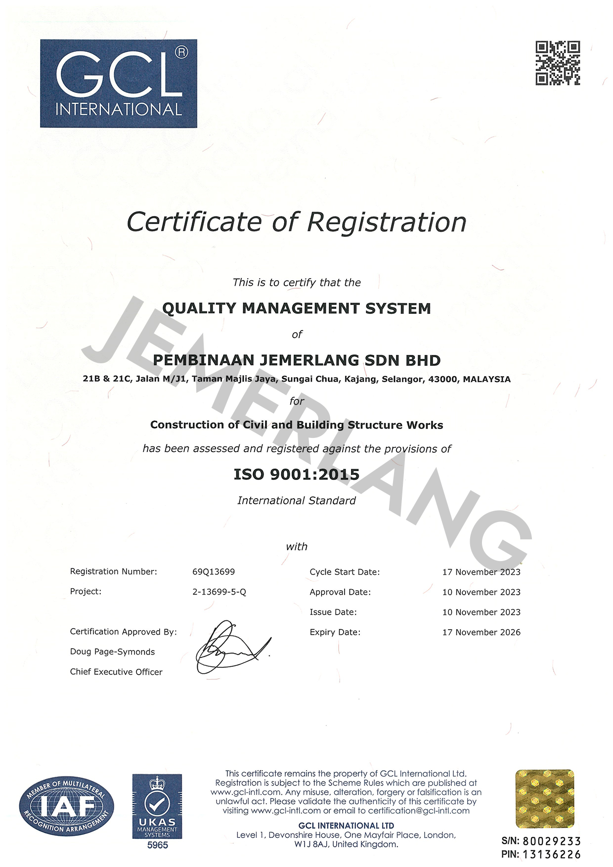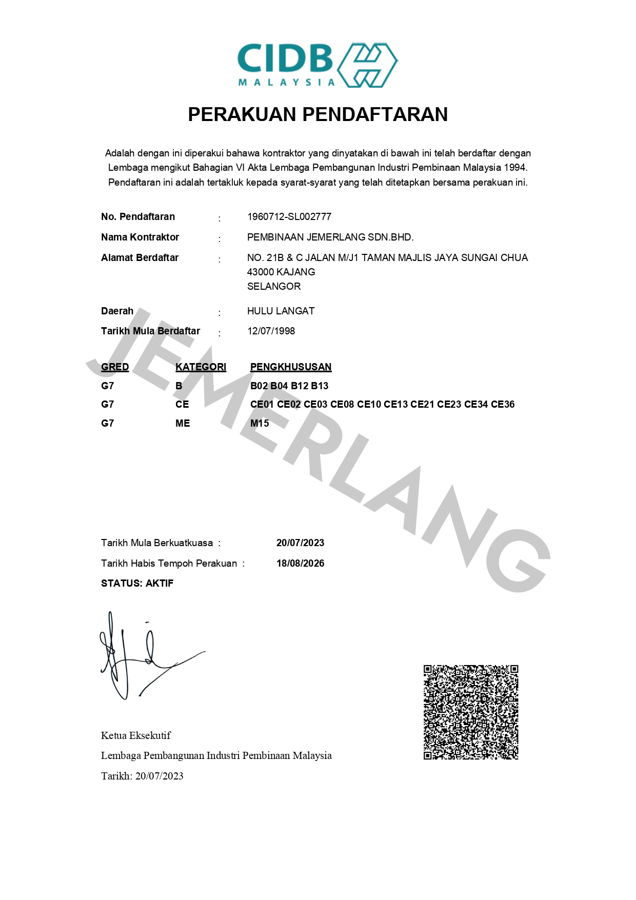 Pembinaan Jemerlang Sdn. Bhd. Reg. No. 198601000037 (149171-H) No. 21B & C, Jalan M/J 1, Taman Majlis Jaya, Sungai Chua, 43000 Kajang, Selangor, Malaysia.